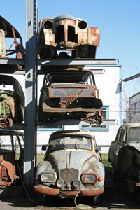 Eines Tages enddeckte Josef Degener einen Opel Olympia, wie ihn sein Vater besessen hatte und kaufte diesen spontan. Das Auto wurde im Autohaus Degener restauriert und steht auch heute noch in gutem Zustand da. Diese Restauration führte zu der Überlegung, dass alte Autos nicht zwingend verschrottet werden müssen und die Brüder Degener beginnen Autos, die sie in Zahlung nehmen zu verwahren. Aber noch denkt keiner an weitere Restaurierungen. Ende der 80er wird es im Autohaus erneut zu eng und ein neues Gebäude muss errichtet werden, dass 1991 bezogen wird. Da in dem neuen Gebäude aus Lärmschutzgründen keine Karosseriearbeiten erlaubt waren, wurde noch eine Halle mit Karosseriewerkstatt im Industriegebiet gebaut. Damals waren auch umfangreiche Karosseriearbeiten noch an der Tagesordnung. Dies änderte sich nach der Wende. Zu stark beschädigte Autos werden seitdem in den Osten exportiert. Die Karosseriewerkstatt war nicht mehr ausgelastet, was schließlich zu der Idee führte, die gesammelten Autos zu restaurieren. Mit der Restauration wird bei Degener grundsätzlich erst begonnen, wenn alle nötigen Teile vorhanden sind. Dazu steht ein umfangreiches Ersatzteillager zur Verfügung, dass wir besichtigen dürfen. Nach Themengebieten sortiert liegen unzählige Teile auf einem Hochregal in der Halle neben der Werkstatt. Darunter warten ca. 50 Opel auf ihre Restaurierung. Durch die Hallen-Tore fällt der Blick aufs Freigelände, wo über 100 weitere mehr oder weniger vollständig ausgeschlachtete Autos nebeneinander stehen. Der Anblick erinnert an die Zeit, als es noch Schrottplätze gab und man mit der Werkzeugkiste in der Hand auf Ersatzteilsuche ging. Ganz hinten stehen unter einem Dach 6 Opel Blitz Feuerwehr-Fahrzeuge, ein weiterer Blitz (LKW) steht quer davor.