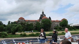 Nachdem alle Teilnehmer eingecheckt hatten, gab es um 19.00 Uhr Abendessen Elisabeth, Walther und Rolf hießen uns recht herzlich willkommen. Und erläuterten uns das ausgedachte Vorprogramm für die Saab-Freunde. Der neue Tag wurde mit einem sehr guten und leckeren Frühstücksbuffet begonnen. Um 10.00 Uhr machte sich die Truppe auf zur Moritzburger Straße – zur Straßenbahnhaltestelle. Die Tickets wurden recht schnell gelöst und die Straßenbahn lies auch nicht lange auf sich warten. Es ging zum Theaterplatz nach Dresden. An dieser Stelle noch einmal lieben Dank an Rolf für die gute Führung in die Innenstadt. Nach circa einer halben Stunde Straßenbahnfahrt erreichten wir den Theaterplatz. Dort erwarteten uns schon Elisabeth und Walther. Walther hatte eine kleine Stadtbesichtigung geplant. Sie führt uns an der katholischen Hofkirche vorbei, durch den Zwinger. Danach ging es weiter zum neuen Schloss. Zum Glück war das neue Schloss mit einem Glas Dach überdacht, da es zu dieser Zeit einen starken Regenschauer gab. Nach 5 Minuten hörte es schon wieder auf zu regnen und die Stadtführung ging weiter zum Stallhof, vorbei am Verkehrsmuseum Dresden zur Frauenkirche. Nach der Frauenkirche führte uns Walther an der Festung Dresden vorbei. Dort wurde das schöne Panorama genossen, bevor es auf ein Schiff ging. An dieser Stelle möchten wir Walther herzlichst für die Stadtführung und die umfassenden Informationen danken, die der Sightseeing Tour per Schiff der Sächsischen Dampf Schifffahrt vorausging. Mit einem ging es über die Elbe. Eine Tonbandstimme lieferte uns sehr viele Informationen über die Sehenswürdigkeiten an denen wir vorbeifuhren. „Am Blauen Wunder“ drehte das Schiff und fuhr wieder zurück. Ich nutzte die Rückfahrt und ging auf das Oberdeck, um noch einmal Fotos zu schießen. Nach eineinhalb Stunden legte das Schiff wieder an. Man erhielt noch einmal eine ganz andere Sicht auf Dresden. Nach der Schifffahrt hatten wir noch Zeit um uns frei in Dresden zu bewegen.