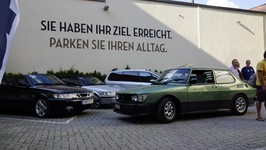 Die Vorfreude auf ein Wiedersehen mit dem Saab-Fan-Urgestein Martin Sailer (zuletzt gesehen hatten wir uns 1988 (!) beim Treffen des Saab-Owners Club GB in Beaulieu) fuhr auf der 800 km langen Hinfahrt mit. Auch mit voll eingeschalteter Klimaanlage sprich geöffneten hinteren Ausstellfenstern war es bei 30 Grad doch noch ganz schön warm im Cockpit, dafür hatte der V4 sehr zur Freude der Piloten keine thermischen Probleme!